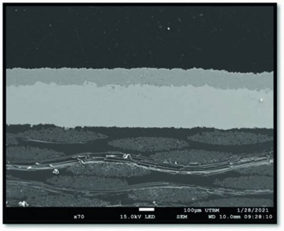 Le tableau 2 présente les différents essais menés avec l’oxyde de chrome. Les paramètres opératoires étudiés sont la vitesse de translation de la torche plasma projetant l’oxyde de chrome, la vitesse d’alimentation en poudre (débit massique) et l’épaisseur de la sous-couche de zinc, le nombre de passes réalisées. Tout d’abord, 4 passes de revêtements Cr2O3 sont effectuées sur un substrat revêtu de 50 µm de Zn(1). Un faible débit massique de poudre (vitesse plateau de 5 %) est choisi pour ne pas transmettre trop de chaleur à l’ensemble substrat/sous-couche. Mais le revêtement s’est détaché (cf. figure 6 - 1). La chaleur transmise au revêtement de Zn, puis à la surface du substrat, a fragilisé l’interface (détérioration du thermoplastique) : à cause d’un flux de chaleur du plasma trop important (vitesse de projection trop lente) et/ou par une protection insuffisante (épaisseur de Zn trop faible) pour résister à ce flux de chaleur et aussi au gradient thermique du au refroidissement des particules fondues de Cr2O3. Ensuite un deuxième essai avec seulement 2 passes est réalisé. Une détérioration est à nouveau observée sur certaines zones, mais d’autres sont intactes comme le montre la figure 6-2. Le troisième essai se caractérise par une seule passe effectuée mais avec 4 fois plus de poudre injectée. Par rapport au premier essai, la même quantité de Cr2O3 est projetée sur la sous-couche (4 passes à vitesse plateau de 5 % contre 1 passe à vitesse plateau de 20 %). À nouveau le revêtement est dégradé. L’épaisseur de la sous-couche est donc en cause. Alors, des sous-couches de Zn, plus épaisses de 90 et 130 µm, sont testées pour protéger davantage l’interface en atténuant le gradient thermique (flux plasma + refroidissement des particules) lors de la réalisation du revêtement céramique. Également, la vitesse de projection est augmentée à 800 mm/s. Des revêtements de 2 puis 4 passes (essais 4 et 5 respectivement) sur une sous-couche de Zn de 90 µm, puis 10 passes (essai 6) sur 130 µm de Zn sont réalisés. Le résultat donne dans les 3 cas une conservation de l’intégrité des revêtements sur l’ensemble de la surface des substrats recouverts. Les observations de la section de ces revêtements montrent une parfaite cohésion à l’interface. La sous-couche est toujours bien adhérente au composite. La cinématique de projection est ensuite affinée afin de réaliser des revêtements Cr2O3 plus épais afin de convenir à l’application industrielle cible comme le présente la Figure 7.