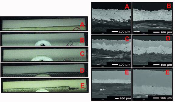 La même démarche est ensuite appliquée pour le second procédé de projection à utiliser pour revêtir le substrat. Il s’agit du procédé HVOF associé au matériau NiCr-Cr2C3 (cf. figure 8). Pour donner suite aux essais précédents, une épaisseur de sous-couche Zn de 100 µm est choisie (cf. tableau 3). La vitesse de projection de 800 mm/s est conservée. Un premier essai est mené avec 35 passages de la torche devant le substrat revêtu de Zn (A). Le revêtement obtenu est intact ; ce qui montre que cette épaisseur est suffisante cette fois-ci pour le procédé HVOF (cf. figure 9). Un deuxième essai identique confirme le résultat précédent (B). Afin de se rapprocher des conditions de travail de l’industriel sur ses pièces, la vitesse de projection est augmentée à 1,5 m/s. En augmentant le nombre de passes à 70, le revêtement de NiCr-Cr3C2 croit en épaisseur (C). Puis en doublant et quintuplant encore le nombre de passes (D puis E), le revêtement atteint 250 µm sans montrer de détérioration à la fois dans sa microstructure très dense et la cohésion à l’interface avec le substrat. L’adhérence des revêtements est testée toujours avec le dispositif PAThandy. Les valeurs obtenues se positionnent entre 4 à 7 MPa. Il apparaît que la vitesse de projection n’influe pas sur les valeurs d’adhérence. En revanche, l’augmentation de l’épaisseur du revêtement se traduit par une légère diminution de l’adhérence.