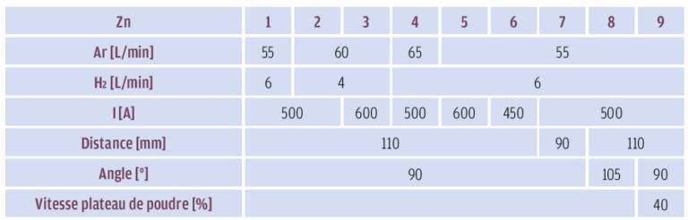 Le procédé plasma APS est utilisé pour réaliser la sous-couche de zinc du fait du cahier des charges imposant les procédés possédés par l’industriel ; le procédé HVOF étant inadapté pour les matériaux à bas point de fusion. Le zinc ayant une température de fusion de 419 °C, le traitement thermique des particules ne doit pas être trop important pour ne pas vaporiser ce matériau. Habituellement, le procédé arc fil est utilisé pour le zinc. Dans ce cas présent, le plasma qui est approprié aux matériaux à haut point de fusion, comme les céramiques, doit être adapté en termes de paramètres opératoires. Notamment il ne doit pas être trop chaud pour ne pas éviter de vaporiser et oxyder le zinc. Plusieurs réflexions se présentent alors : travailler avec un plasma de faible puissance et/ou limiter le temps de séjour des particules dans le jet thermique. C’est pourquoi différents paramètres sont testés :